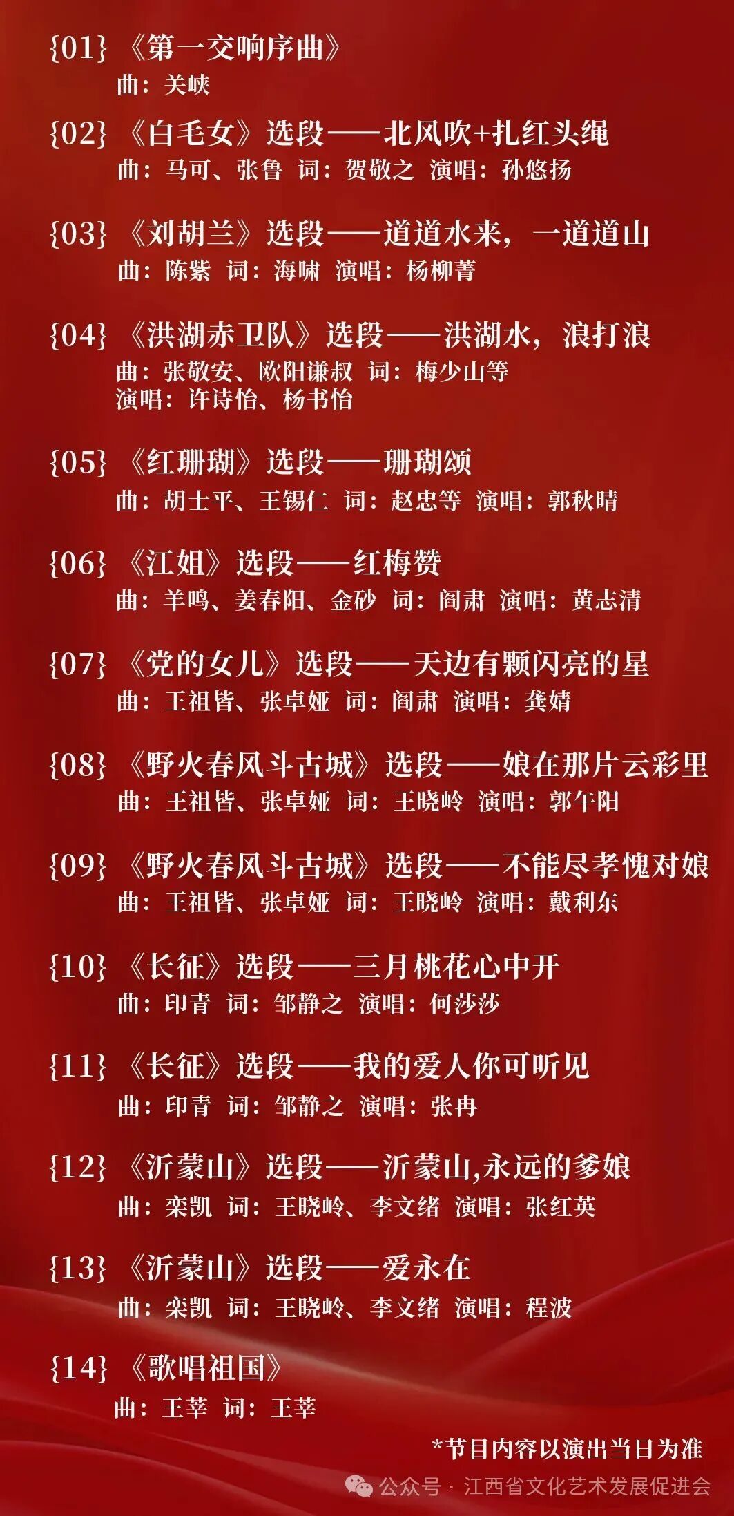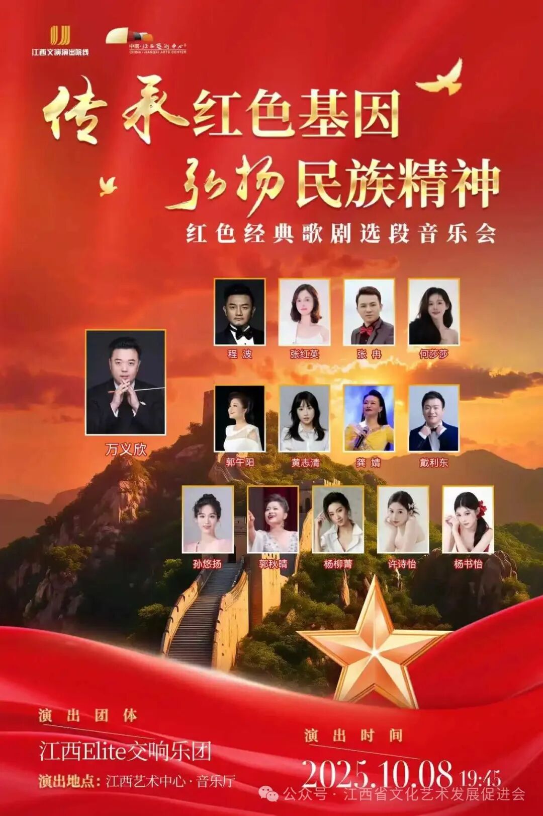 由江西文演演出院线、江西艺术中心主办,江西省文化艺术发展促进会联合江西省歌舞剧院有限责任公司、南昌点圈文化传媒有限公司、江西音药文化传媒有限公司共同承办的,“传承红色基因 弘扬民族精神”——红色经典歌剧选段音乐会,于2025年10月8日19:45,在江西艺术中心音乐厅隆重上演。