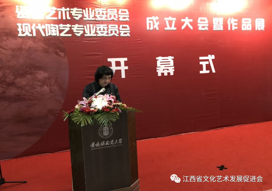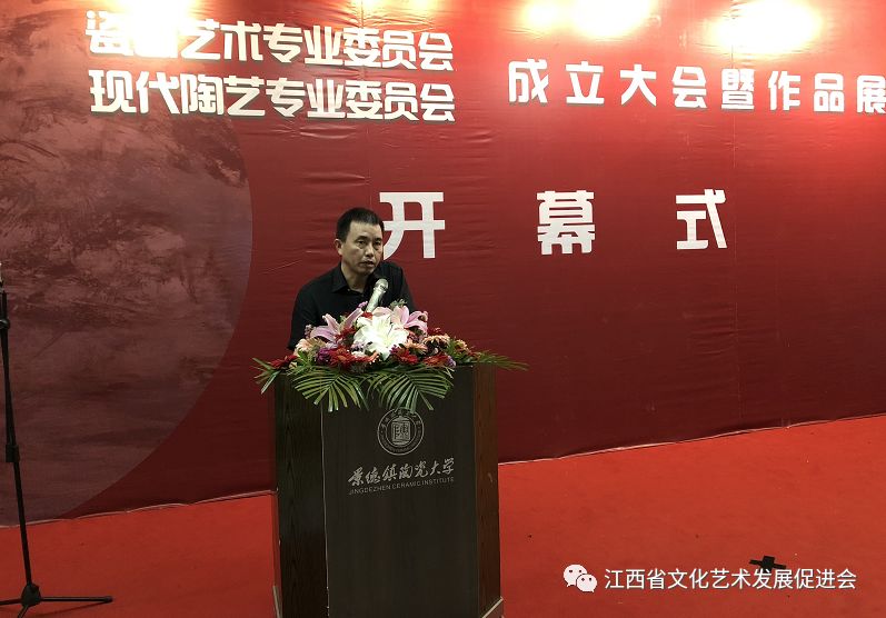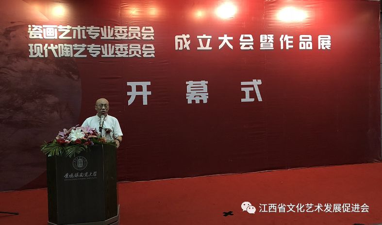 江西省文化艺术发展促进会会长张鉴瑞致辞,并宣读关于成立瓷画艺术专业委员会和现代陶艺专业委员会及任职人员的批复。