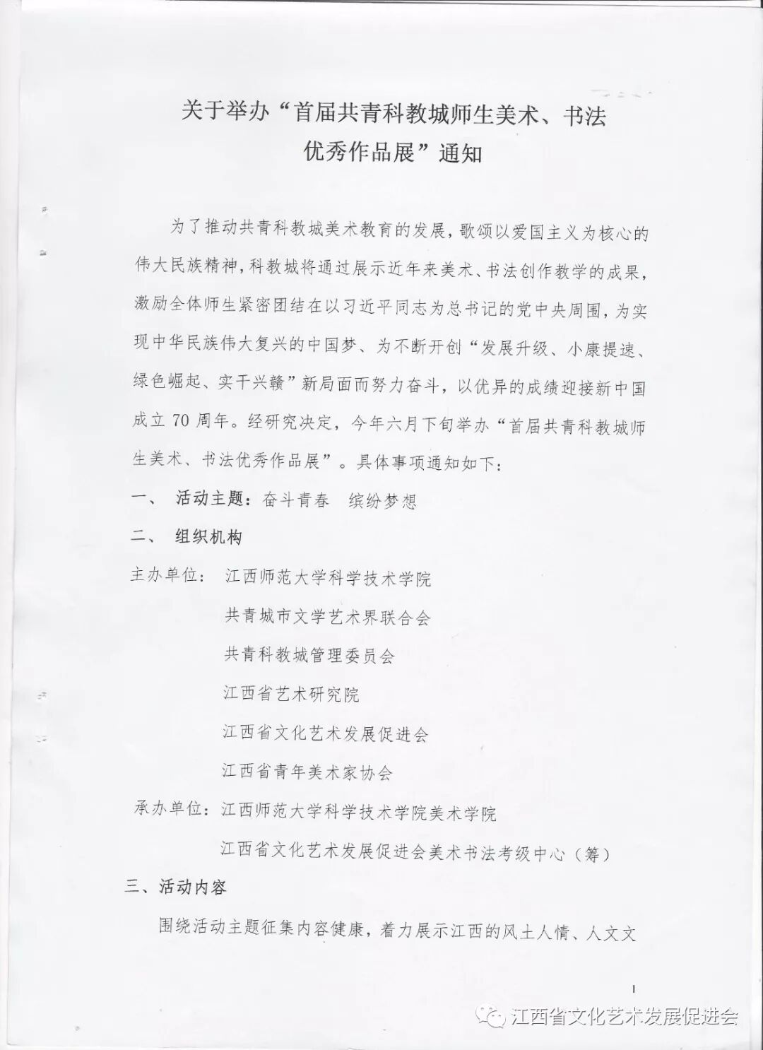 为了推动共青科教城美术教育的发展,歌颂以爱国主义为核心的伟大民族精神,科教城将通过展示近年来美术、书法创作教学的成果,激励全体师生紧密团结在以习近平同志为总书记的党中央周围,为实现中华民族伟大复兴的中国梦、为不断开创“发展升级、小康提速、绿色崛起、实干兴赣”新局面而努力奋斗,以优异的成绩迎接新中国成立70周年。经研究决定,今年六月下旬在共青科教城举办“首届共青科教城师生美术、书法优秀作品展”。具体事项通知如下: