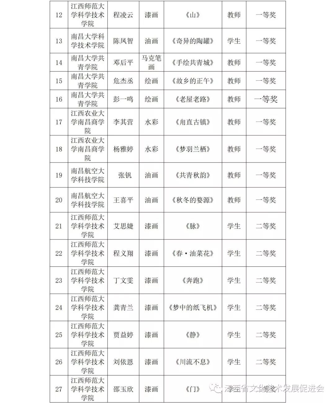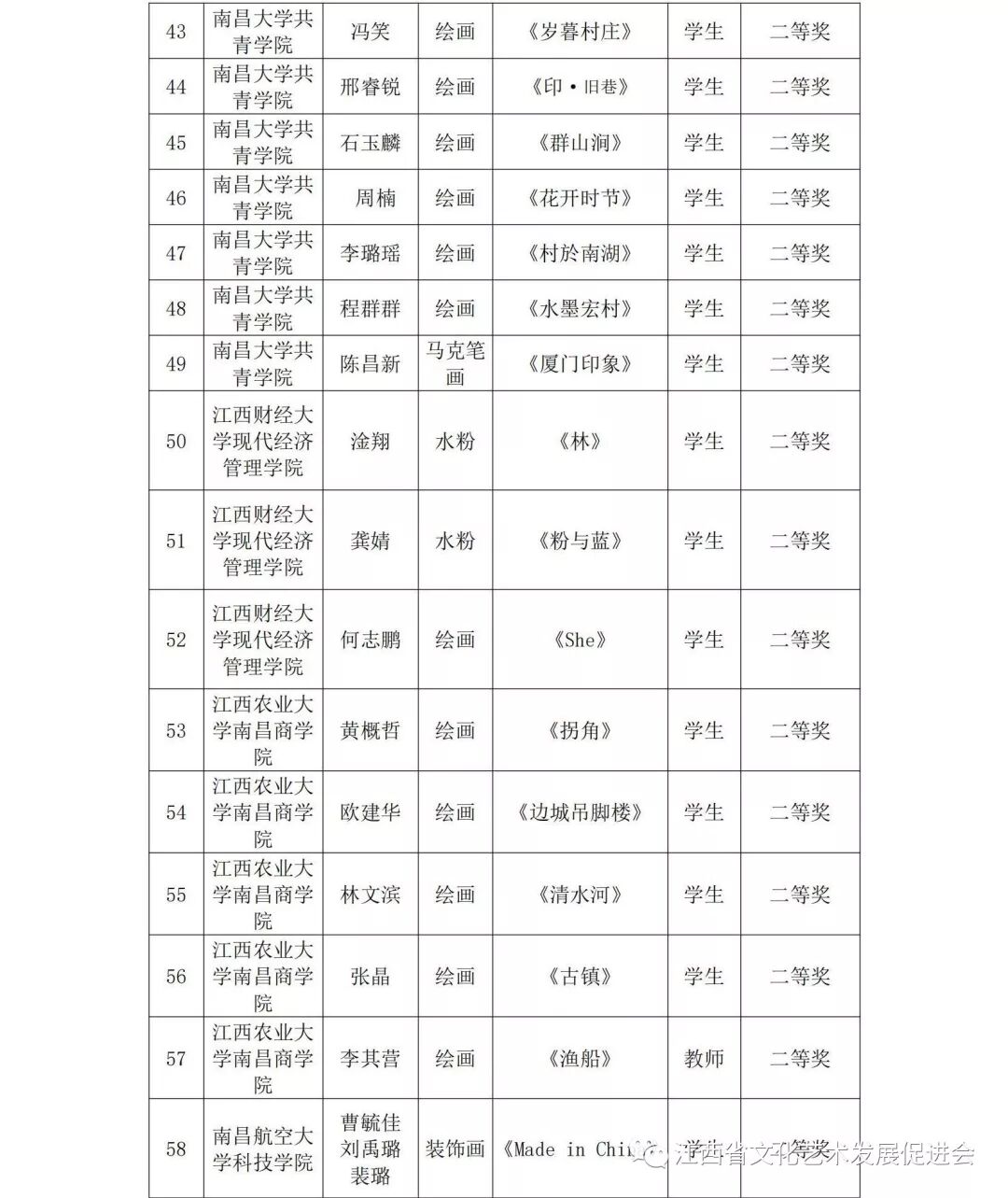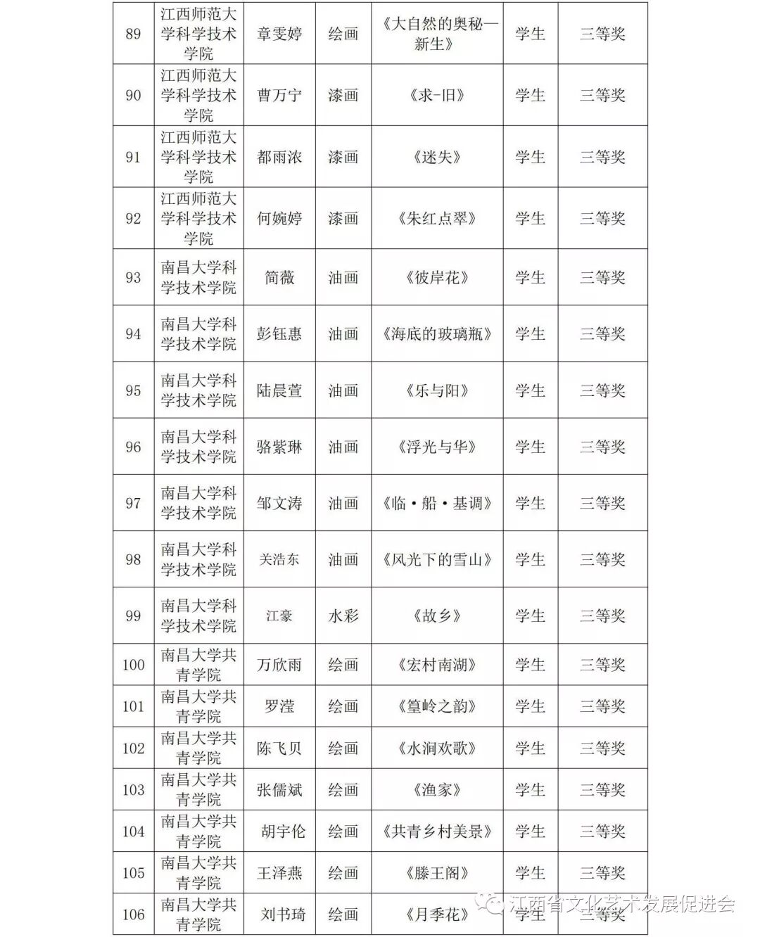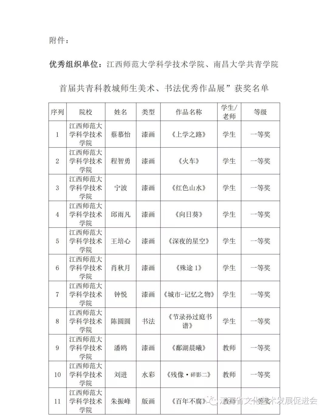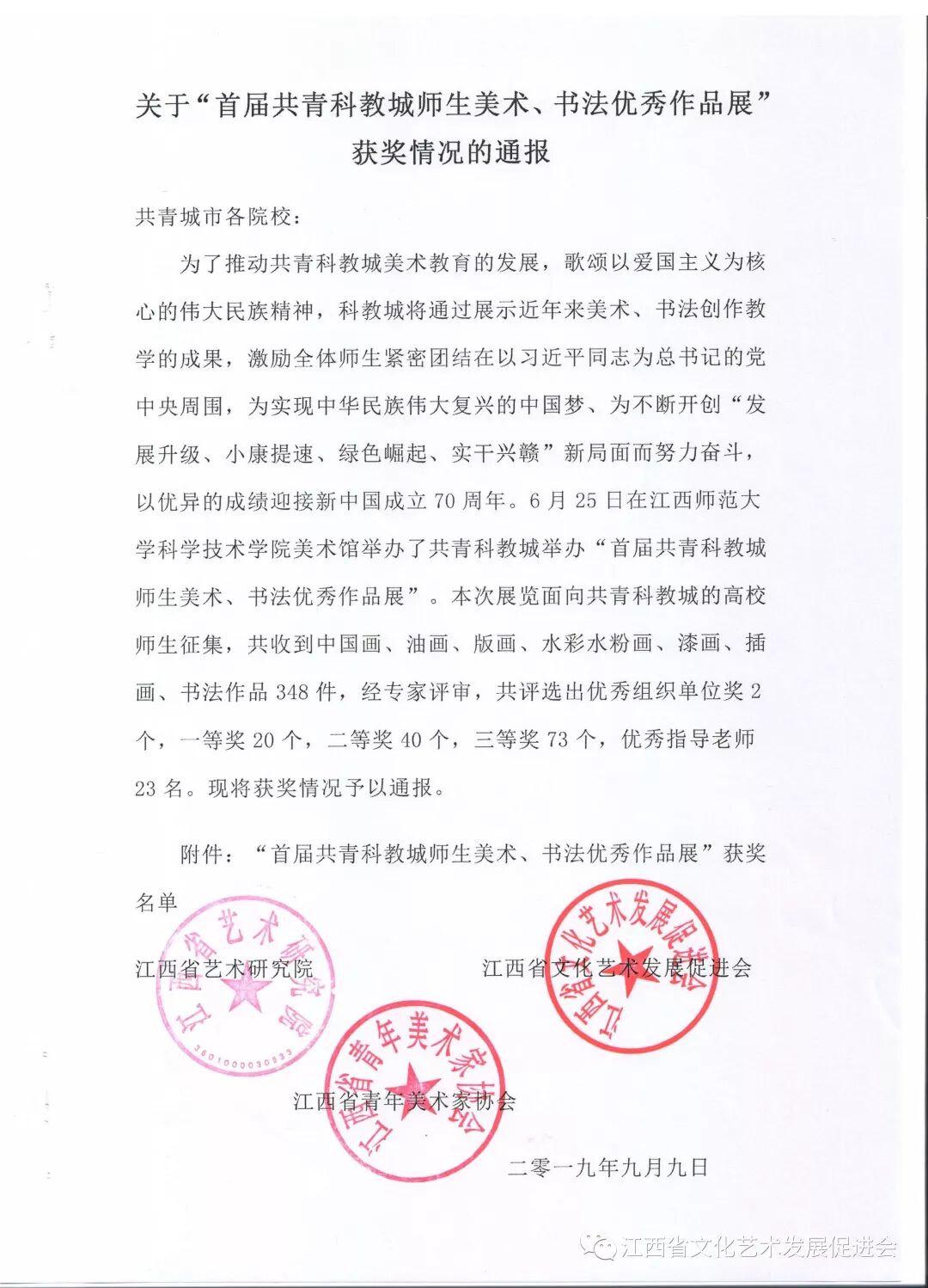 为了推动共青科教城美术教育的发展,歌颂以爱国主义为核心的伟大民族精神,科教城将通过展示近年来美术、书法创作教学的成果,激励全体师生紧密团结在以习近平同志为总书记的党中央周围,为实现中华民族伟大复兴的中国梦、为不断开创“发展升级、小康提速、绿色崛起、实干兴赣”新局面而努力奋斗,以优异的成绩迎接新中国成立70周年。6月25日在江西师范大学科学技术学院美术馆举办了共青科教城举办“首届共青科教城师生美术、书法优秀作品展”。本次展览面向共青科教城的高校师生征集,共收到中国画、油画、版画、水彩水粉画、漆画、插画、书法作品348件,经专家评审,共评选出优秀组织单位奖2个,一等奖20个,二等奖40个,三等奖73个,优秀指导老师23名。现将获奖情况予以通报。