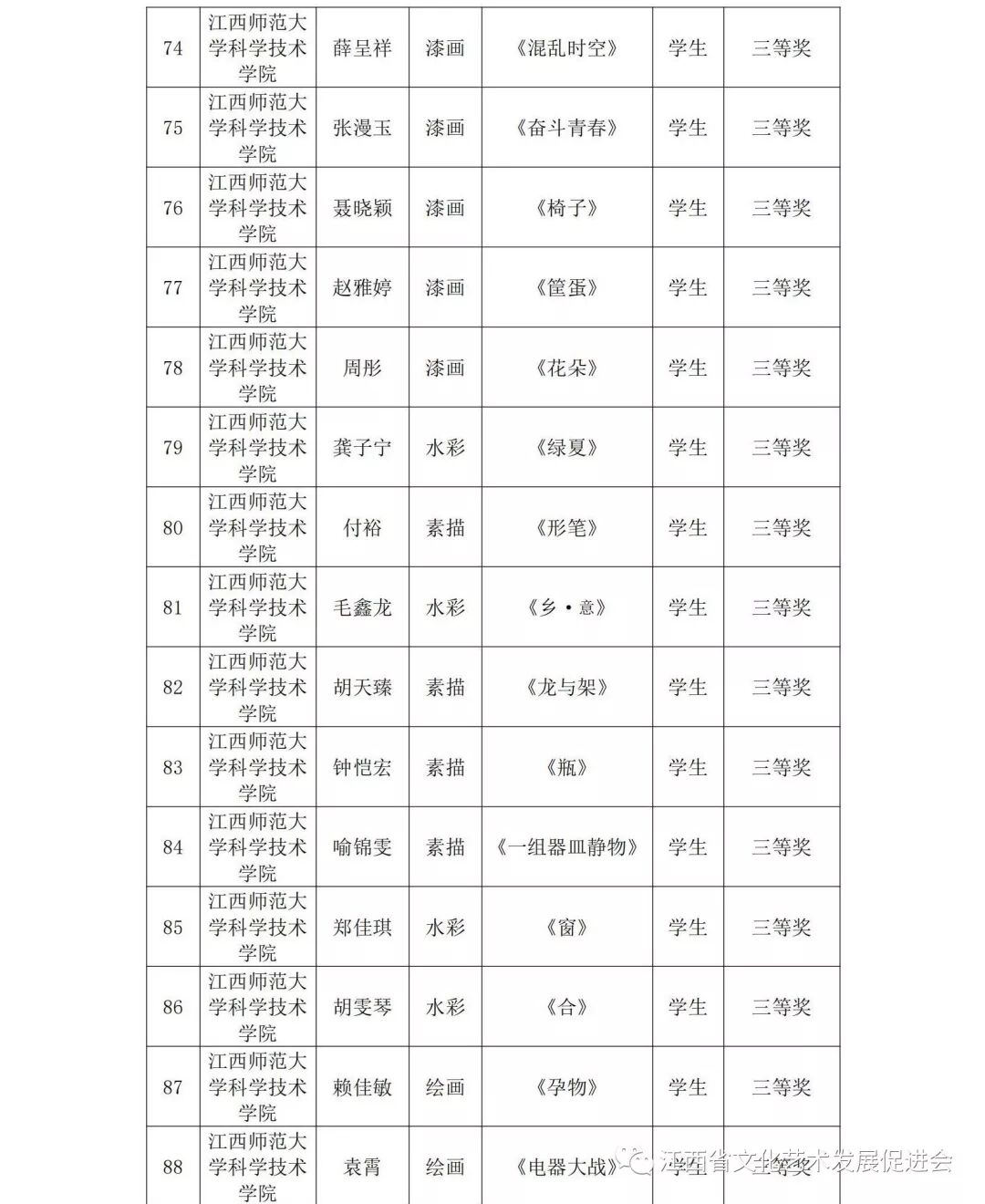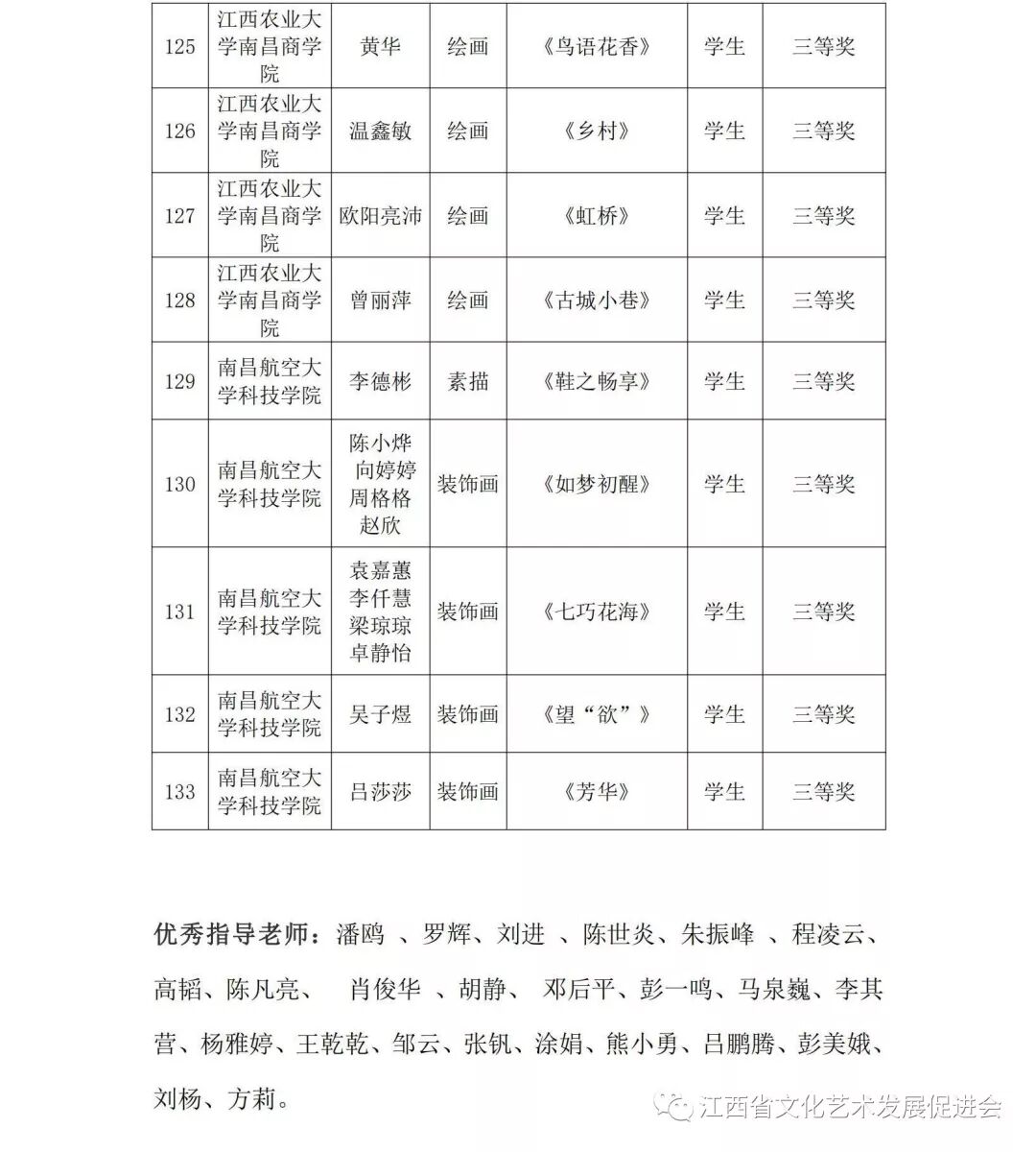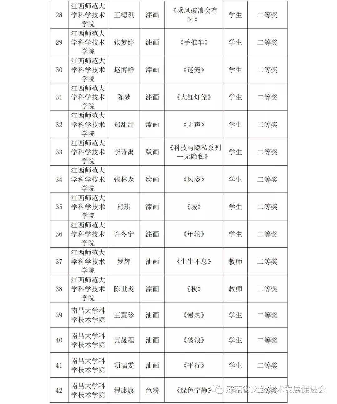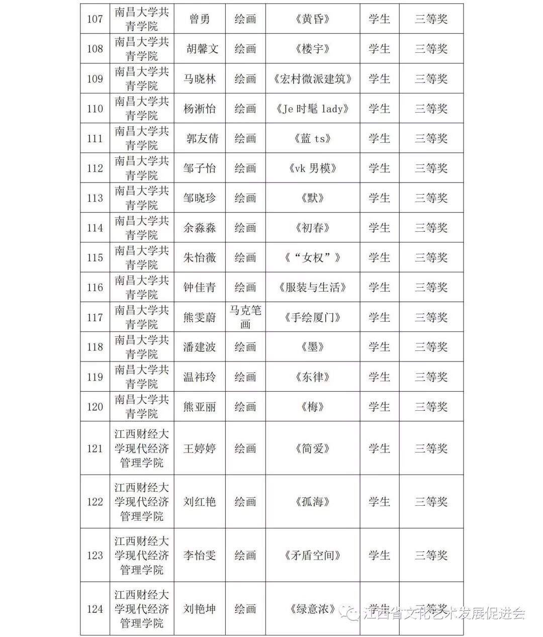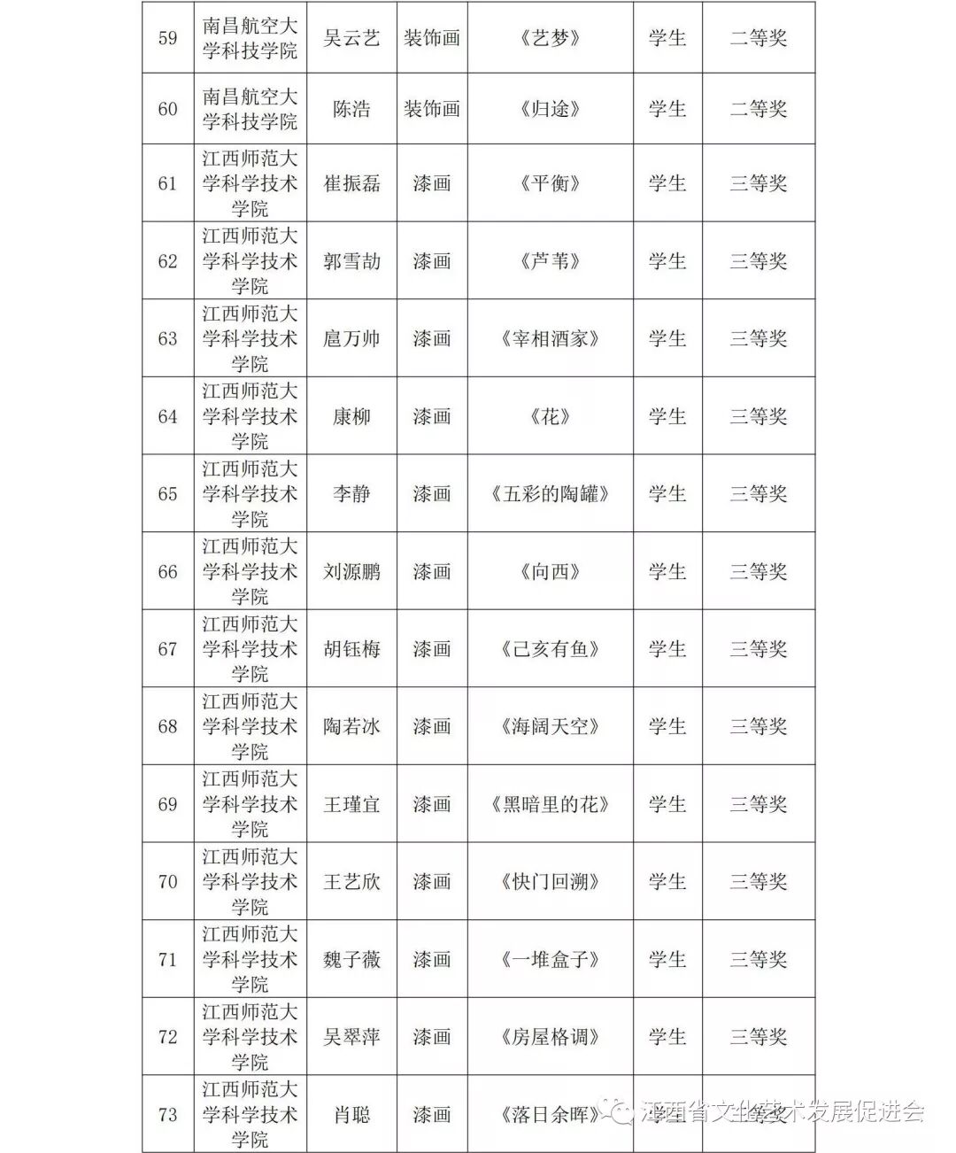 为了推动共青科教城美术教育的发展,歌颂以爱国主义为核心的伟大民族精神,科教城将通过展示近年来美术、书法创作教学的成果,激励全体师生紧密团结在以习近平同志为总书记的党中央周围,为实现中华民族伟大复兴的中国梦、为不断开创“发展升级、小康提速、绿色崛起、实干兴赣”新局面而努力奋斗,以优异的成绩迎接新中国成立70周年。6月25日在江西师范大学科学技术学院美术馆举办了共青科教城举办“首届共青科教城师生美术、书法优秀作品展”。本次展览面向共青科教城的高校师生征集,共收到中国画、油画、版画、水彩水粉画、漆画、插画、书法作品348件,经专家评审,共评选出优秀组织单位奖2个,一等奖20个,二等奖40个,三等奖73个,优秀指导老师23名。现将获奖情况予以通报。