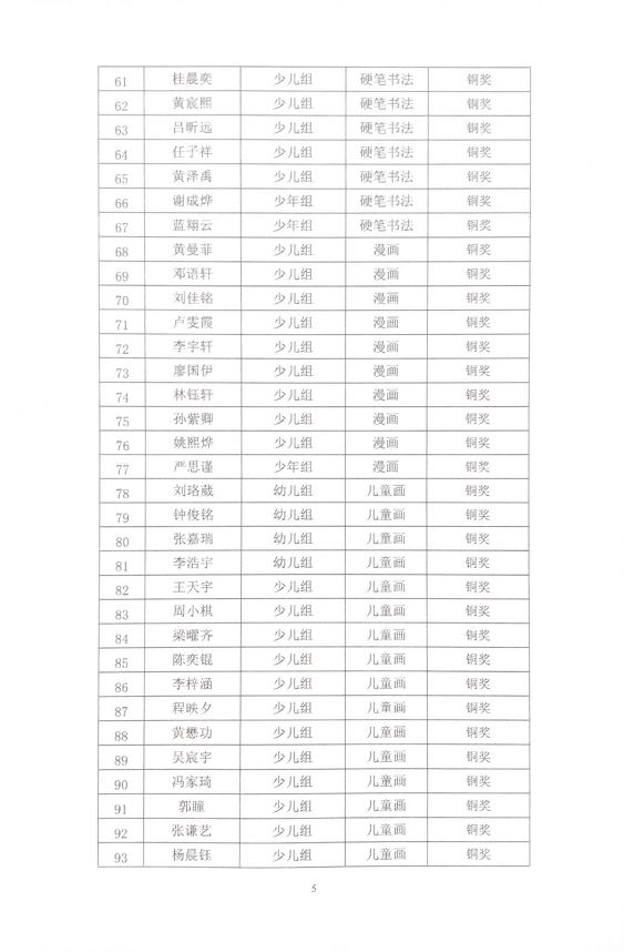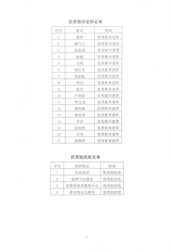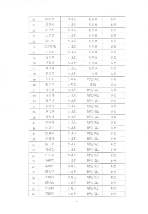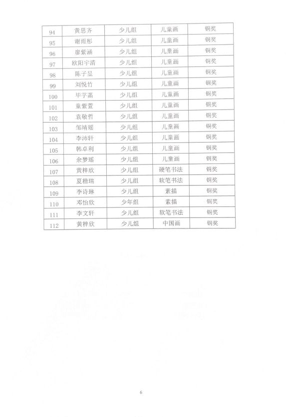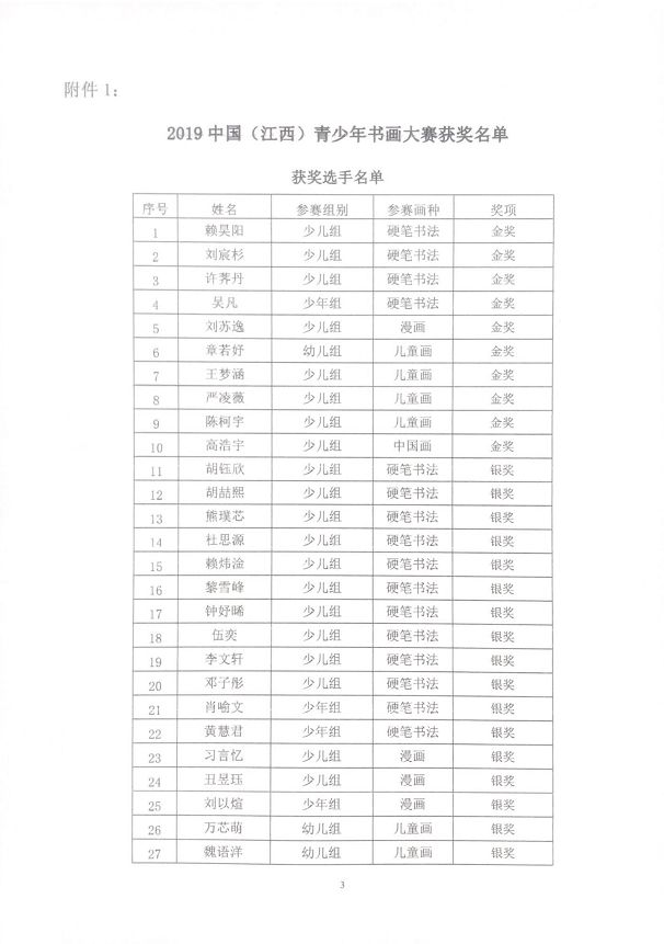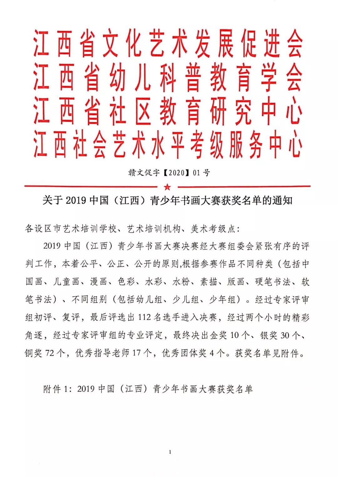 关于2019中国(江西)青少年书画大赛获奖名单的通知各设区市艺术培训学校、艺术培训机构、美术考级点: 2019中国(江西)青少年书画大赛决赛经大赛组委会紧张有序的评判工作,本着公平、公正、公开的原则,根据参赛作品不同种类(包括中国画、儿童画、漫画、色彩、水彩、水粉、素描、版画、硬笔书法、软笔书法)、不同组别(包括幼儿组、少儿组、少年组)。 经过专家评审组初评、复评,最后评选出112名选手进入决赛,经过两个小时的精彩角逐,经过专家评审组的专业评定,最终决出金奖10个、银奖30个、铜奖72个,优秀指导老师17个,优秀团体奖4个。获奖名单见附件。