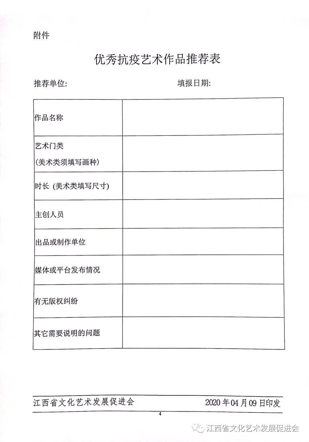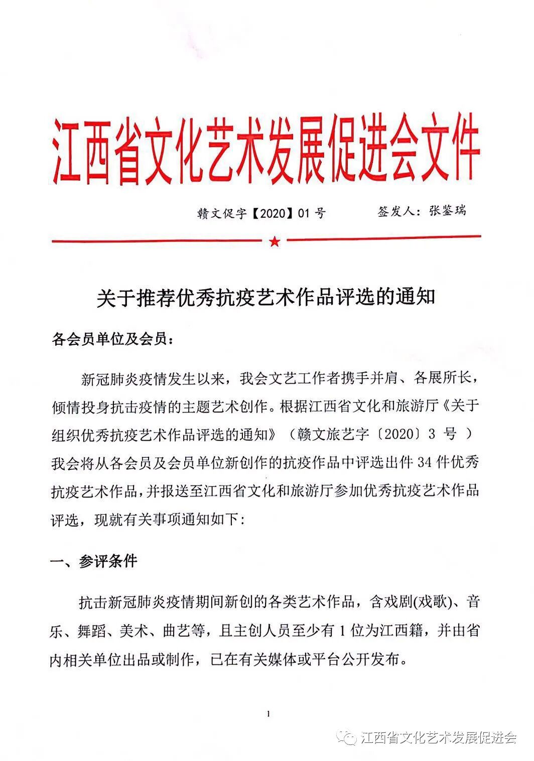 新冠肺炎疫情发生以来,我会文艺工作者携手并肩、各展所长,倾情投身抗击疫情的主题艺术创作。根据江西省文化和旅游厅《关于组织优秀抗疫艺术作品评选的通知》(赣文旅艺字〔2020〕3 号 )我会将从各会员及会员单位新创作的抗疫作品中评选出件34件优秀抗疫艺术作品,并报送至江西省文化和旅游厅参加优秀抗疫艺术作品评选,现就有关事项通知如下: