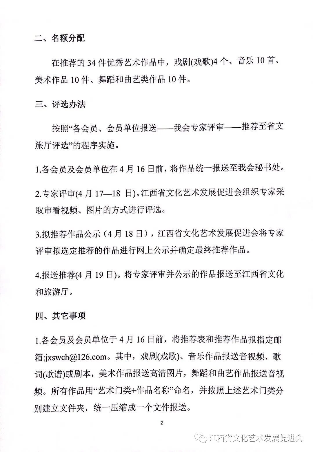 3.拟推荐作品公示(4月18日),江西省文化艺术发展促进会将专家评审拟选定推荐的作品进行网上公示并确定最终推荐作品。