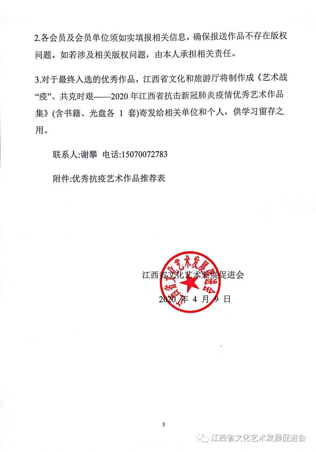 3.对于最终入选的优秀作品,江西省文化和旅游厅将制作成《艺术战 “疫”、共克时艰——2020年江西省抗击新冠肺炎疫情优秀艺术作品集》(含书籍、光盘各 1 套)寄发给相关单位和个人,供学习留存之用。