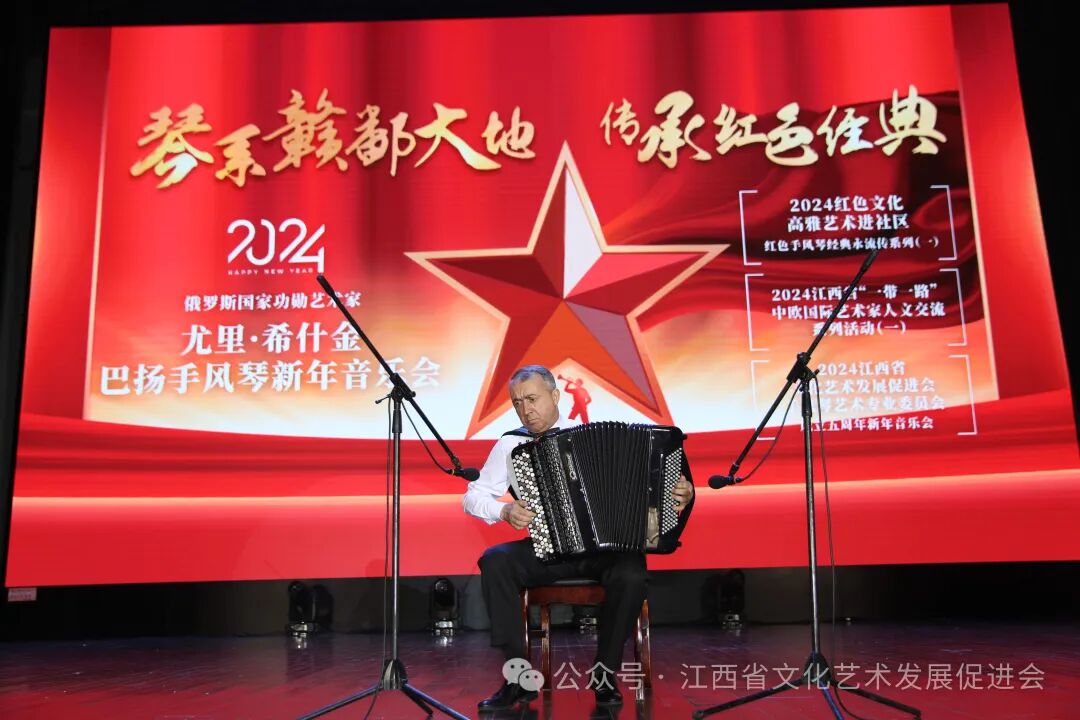 本场演出也是“2024红色文化高雅艺术进社区·红色手风琴经典永流传”及2024江西省“一带一路”中欧国际艺术家人文交流系列活动之一。在本次专场音乐会中,尤里·希什金用他充满热情的表演和精湛的技巧,淋漓尽致地表现了多元的艺术风格与充沛的音乐情感,使听众沉浸在他所描绘的音乐图画之中,为现场观众带来了一场别具一格的视听盛宴,带领大家领略了音乐世界里激烈璀璨的文化碰撞。